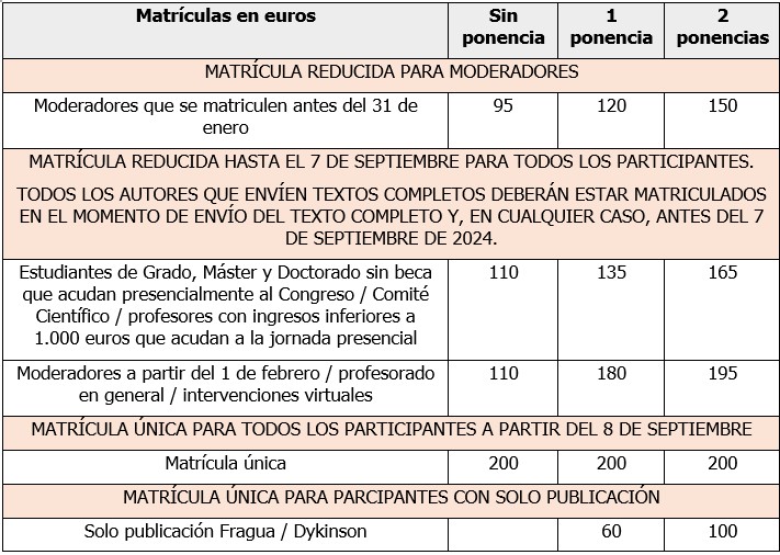 Todos los firmantes de alguno de los textos completos deberán matricularse, como muy tarde, en el momento de envío de dicho texto. En el caso de Dykinson (con o sin defensa de ponencia, antes del 1 de septiembre).